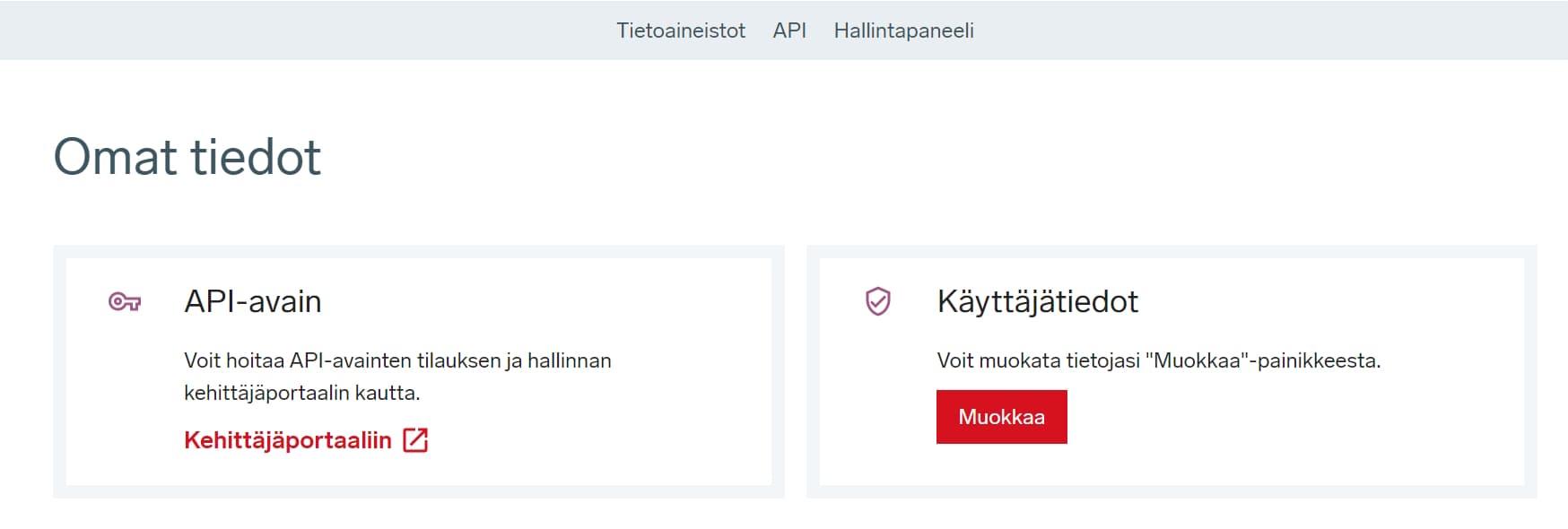 API-avaimen saa rekisteröitymällä palvelun käyttäjäksi ja hyväksymällä palvelun käyttöehdot. Kirjautunut käyttäjä voi itse hallita API-avaimiaan Kehittäjäportaalin kautta